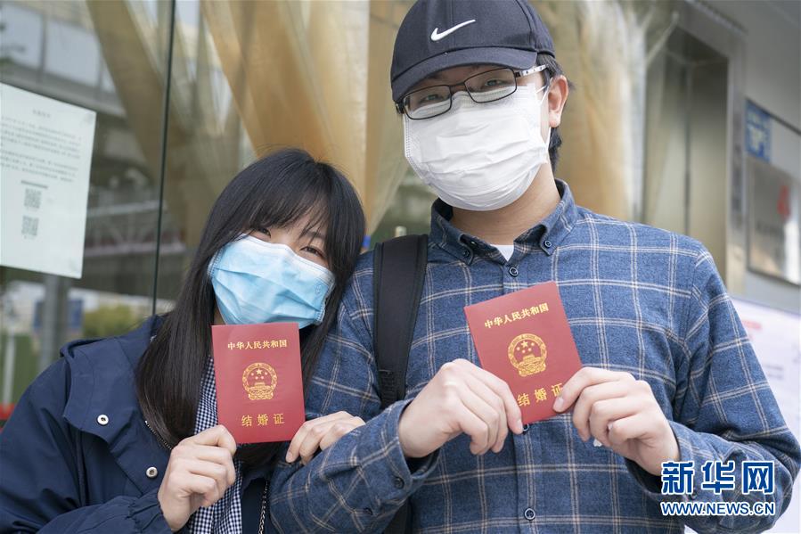 4月7日,在武漢市江岸區(qū)民政局婚姻登記處,新人盧先生和丁女士展示結婚證。 新華社記者才揚攝