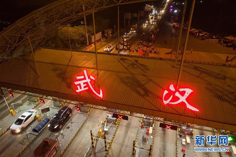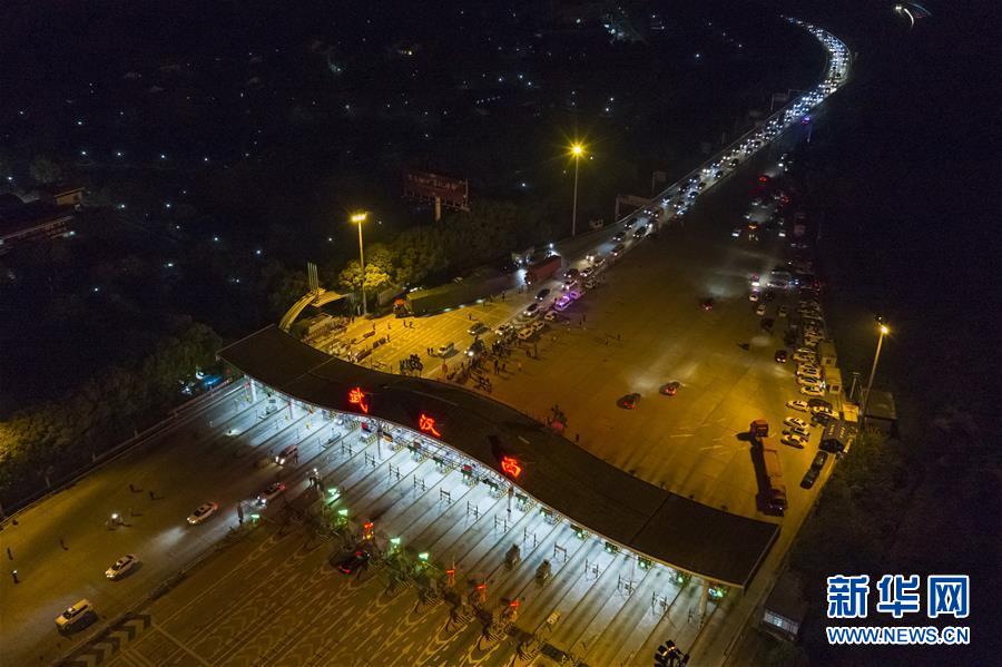 4月8日凌晨,車輛通過武漢西高速收費(fèi)站(無人機(jī)拍攝)。 新華社記者 沈伯韓 攝