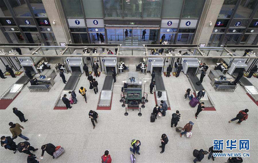 4月7日晚,旅客接受安檢后進入武昌火車站。 新華社記者 費茂華 攝