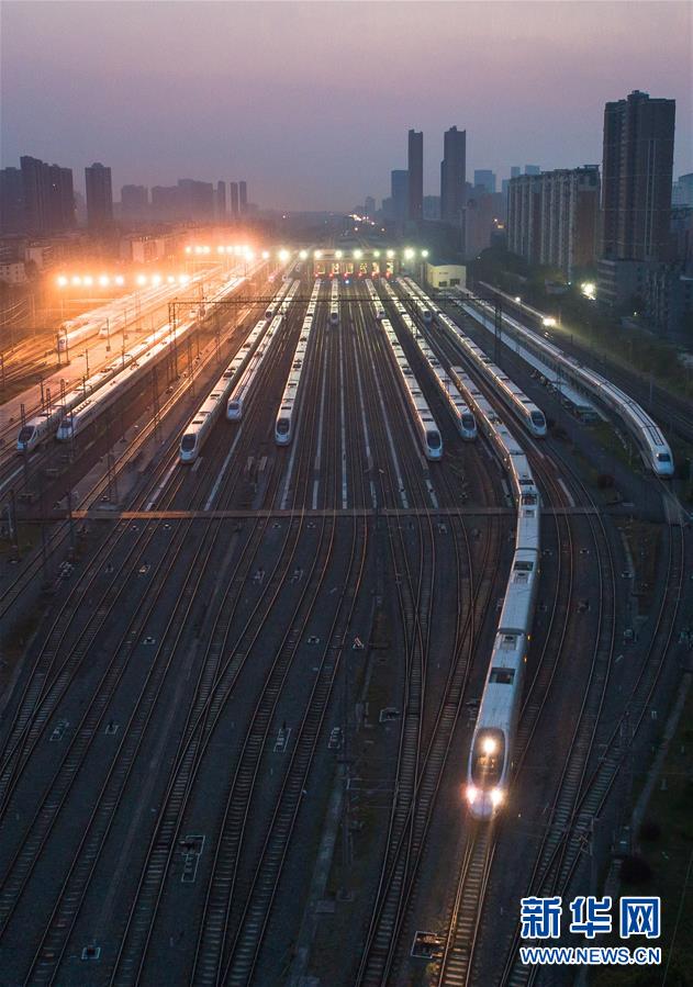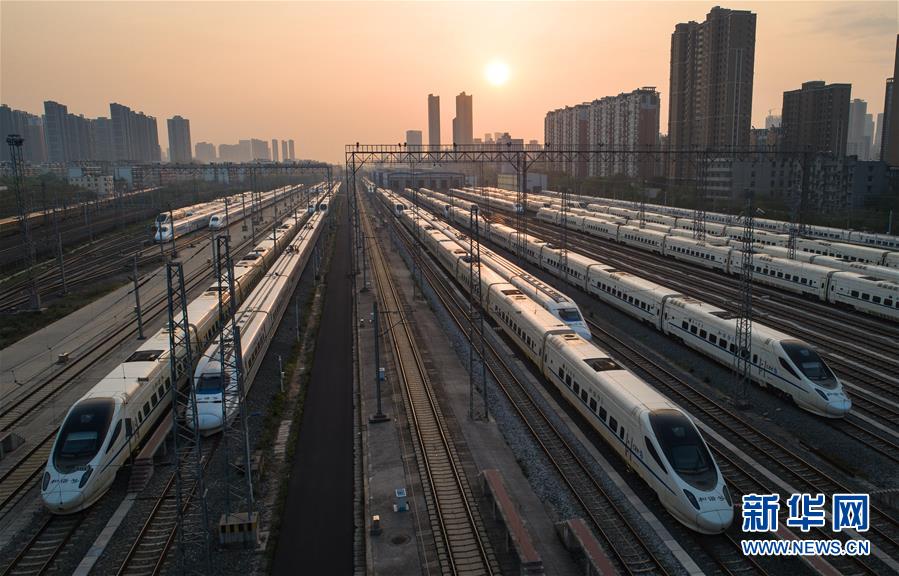 4月8日,在武漢動(dòng)車段,列車??吭诖孳嚲€上準(zhǔn)備投入運(yùn)行。 新華社記者 肖藝九 攝