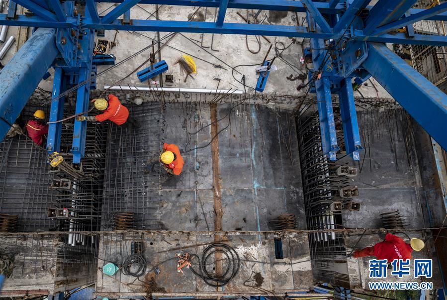 4月8日,中鐵四局的工人們進行鋼桁梁架設作業(yè)。新華社記者江文耀攝
