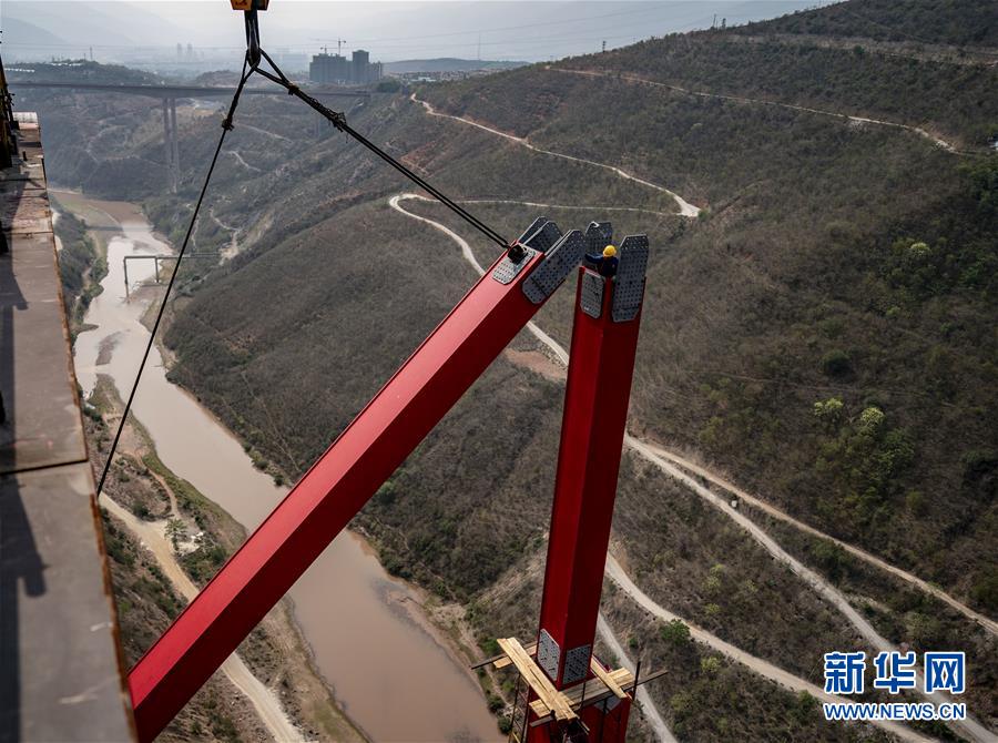4月8日,來自湖北鄂州的中鐵四局工人熊學良進行鋼桁梁架設作業(yè)。新華社記者江文耀攝