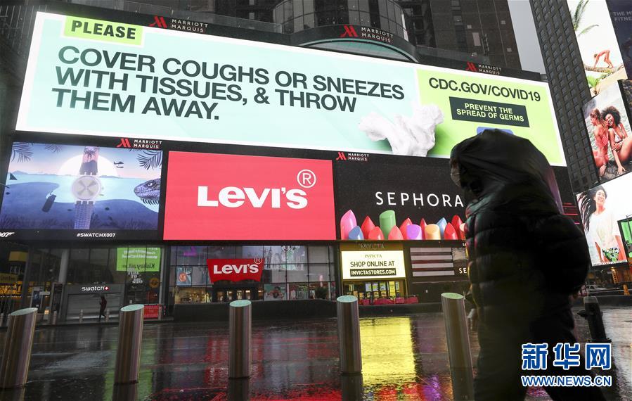 3月23日,在美國紐約時(shí)報(bào)廣場,大屏幕上播放防控新冠肺炎的知識(shí)。新華社記者王迎攝