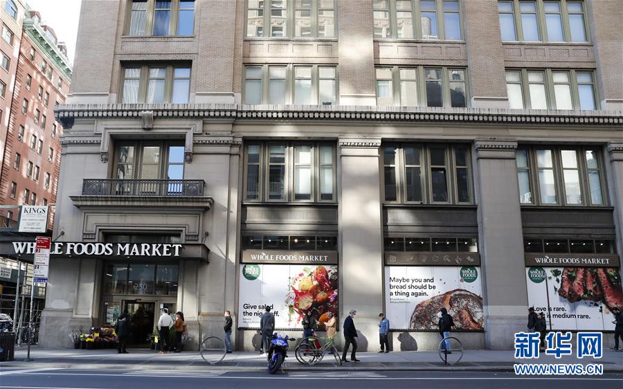 3月21日,在美國(guó)紐約,人們排隊(duì)時(shí)保持距離,準(zhǔn)備進(jìn)入一家超市購(gòu)物。新華社記者王迎攝