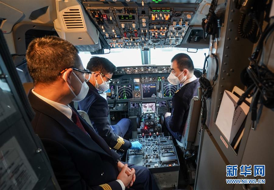 4月8日,東方航空MU2527飛行員在做飛行準備。新華社記者程敏攝