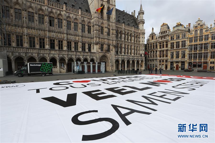 這是4月13日在比利時(shí)布魯塞爾大廣場(chǎng)拍攝的為抗擊疫情加油的巨幅海報(bào)。當(dāng)日,比利時(shí)布魯塞爾市政府工作人員在市中心的大廣場(chǎng)展開一面巨幅海報(bào),上面用法語(yǔ)和荷蘭語(yǔ)印著“一起鼓起勇氣”“謝謝”,以感謝市民及醫(yī)療人員為抗擊疫情所做的努力。新華社記者鄭煥松攝