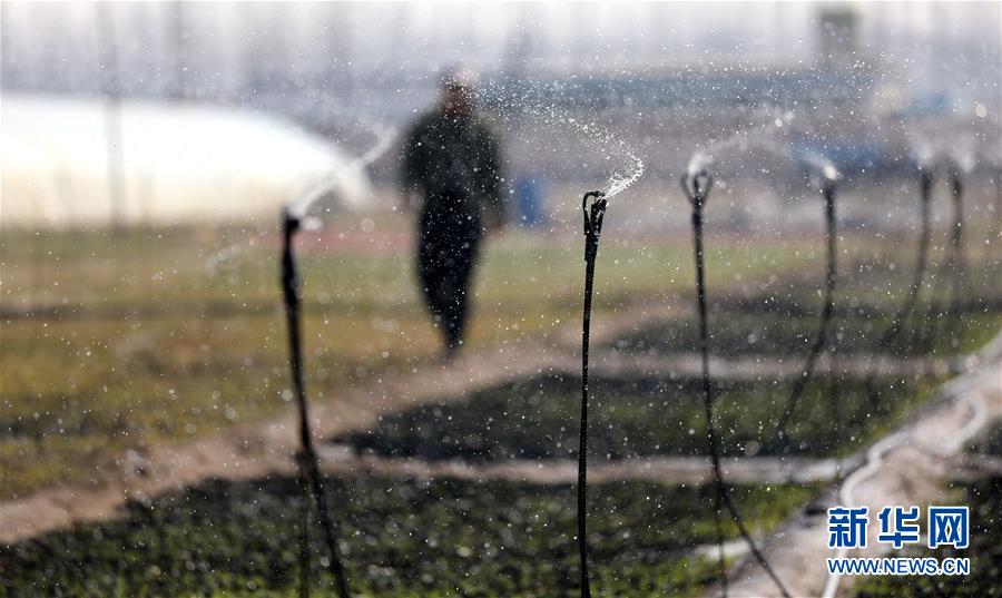 4月13日,在八角臺(tái)街道雅化村,一處剛剛培育的花圃進(jìn)行灌溉。
