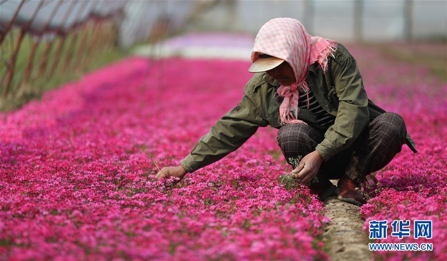 4月13日,在八角臺街道雅化村花圃內(nèi),花農(nóng)為培育的宿根花卉除草。新華社記者姚劍鋒攝