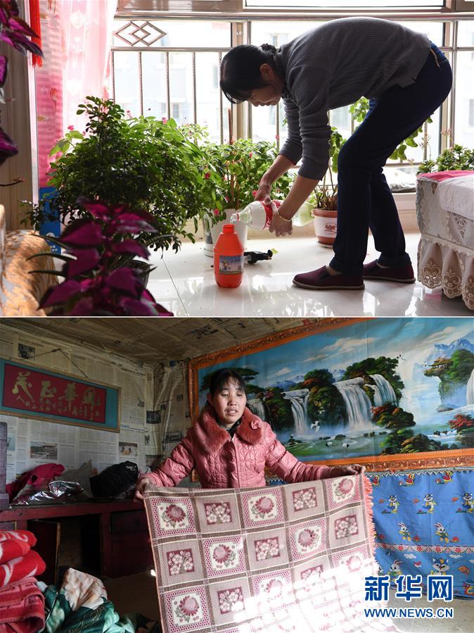 拼版照片:上圖為胥存在古浪縣綠洲生態(tài)移民小城鎮(zhèn)的家中給客廳里的花澆水(4月7日攝);下圖為胥存在古浪縣黃羊川鎮(zhèn)石城村的家中疊床單(2018年2月6日攝)。新華社記者范培珅攝