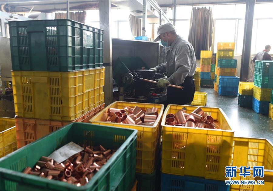 4月13日,員工在位于店口鎮(zhèn)的諸暨市浩??照{(diào)器制造有限公司車間內(nèi)生產(chǎn)銅管件。新華社記者韓傳號攝