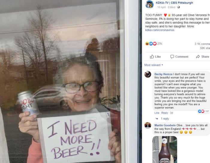 中新網(wǎng)4月14日電據(jù)美國(guó)《世界日?qǐng)?bào)》報(bào)道,近日居家避疫期間,美國(guó)賓夕法尼亞州一名愛(ài)喝啤酒的93歲老太太維若妮西(Olive Veronesi),手持一個(gè)啤酒罐及“我需要更多啤酒”的求助牌站在自家窗戶(hù)旁,家人覺(jué)得有趣把這一幕拍照上傳網(wǎng)絡(luò),后經(jīng)電視臺(tái)發(fā)布引發(fā)關(guān)注。老太太最終獲得廠商贈(zèng)酒。