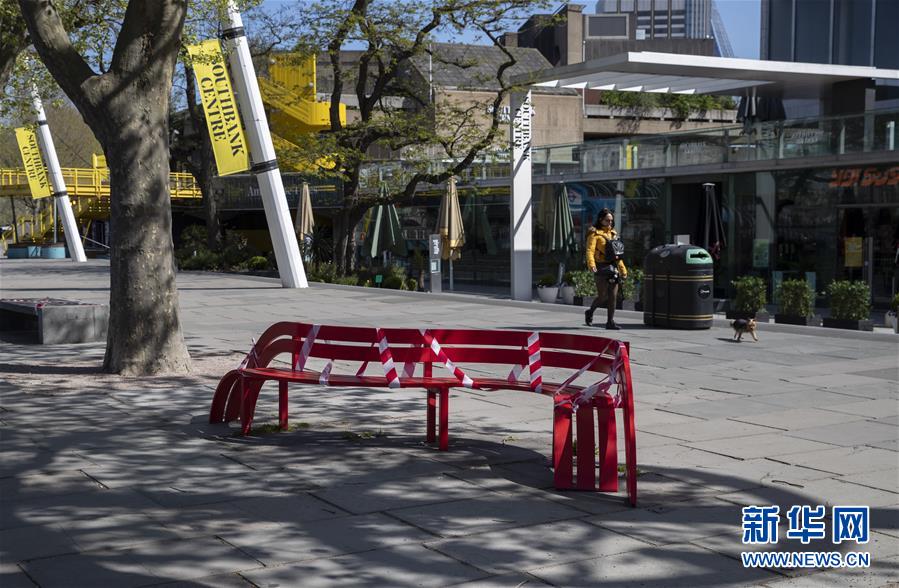 這是4月14日在英國倫敦拍攝的南岸中心前被膠帶纏住的休閑椅。新華社記者韓巖攝