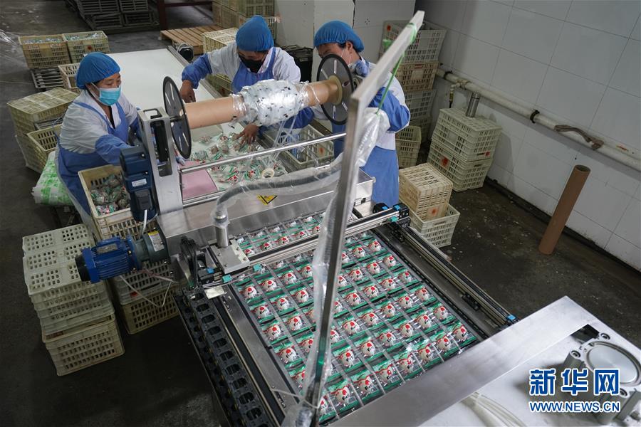 江蘇高郵鴨集團(tuán)的工作人員將塑封好的鴨蛋產(chǎn)品進(jìn)行進(jìn)一步加工作業(yè)(4月15日攝)?!案哙]鴨蛋”是江蘇高郵的特色農(nóng)業(yè)名片。近年來,當(dāng)?shù)卦诹挤N繁育、生態(tài)養(yǎng)殖、產(chǎn)品加工等方面加大力度,推動(dòng)高郵鴨蛋品牌化建設(shè),讓小鴨蛋成為帶動(dòng)農(nóng)戶致富的大產(chǎn)業(yè)。2019年,高郵市共計(jì)生產(chǎn)熟制鴨蛋產(chǎn)品近11.2億枚,年產(chǎn)值近17.68億元。新華社記者李博攝