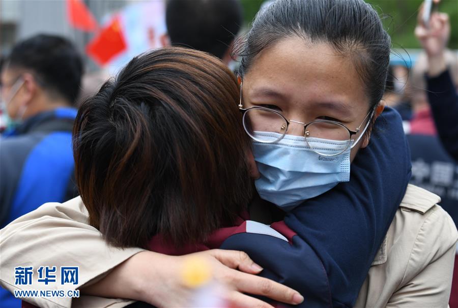 4月21日,在四川大學(xué)華西醫(yī)院,醫(yī)療隊(duì)隊(duì)員和家人相互擁抱。當(dāng)日,來自四川大學(xué)華西醫(yī)院、華西第二醫(yī)院、華西第四醫(yī)院的醫(yī)療隊(duì)隊(duì)員解除隔離休整,與分別許久的家人、同事團(tuán)聚,緊緊相擁。新華社記者王曦?cái)z