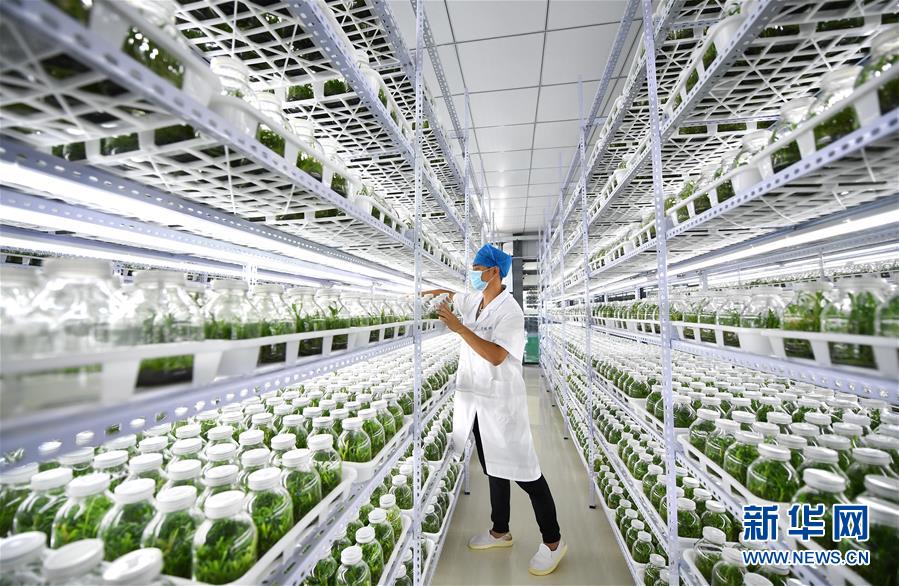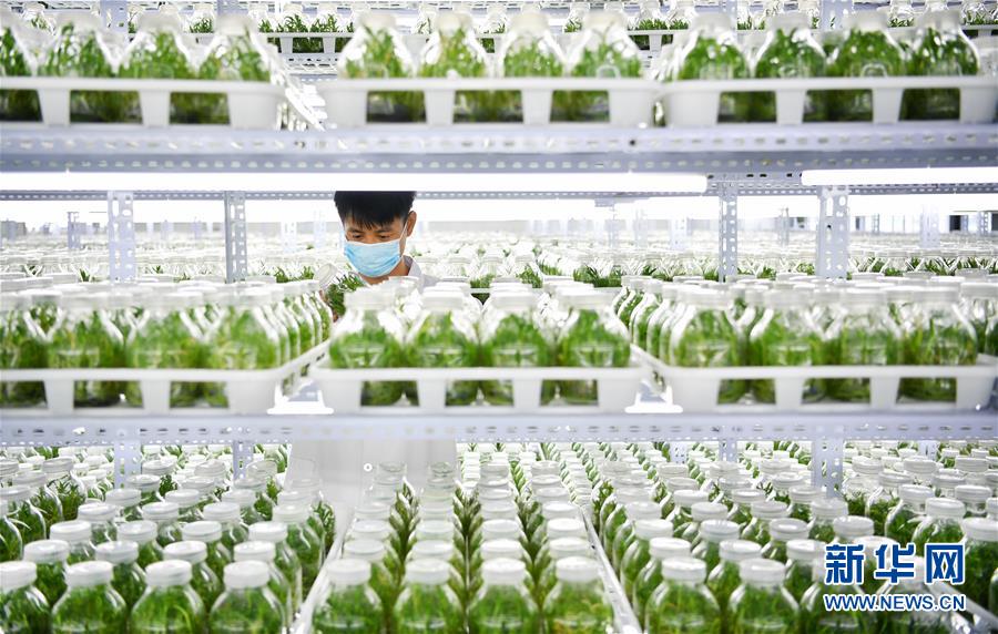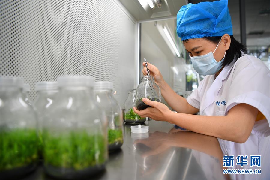 4月21日,在位于施茶村的海南勝嶸生物科技有限公司石斛育種培養(yǎng)室內,工作人員在進行石斛育種。新華社記者郭程攝