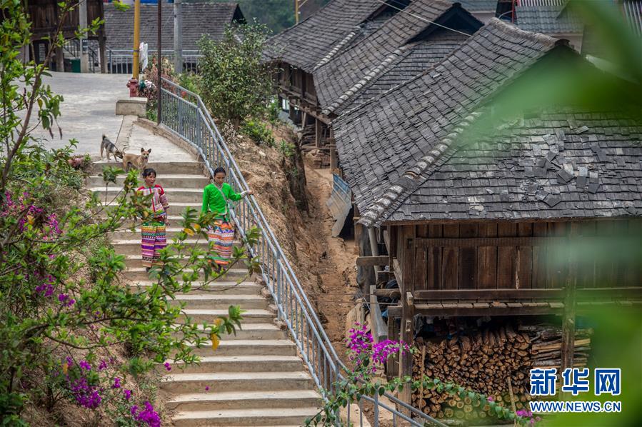 4月12日,在云南省勐??h布朗山鄉(xiāng)曼囡村曼班三隊(duì),娜四(左)和妹妹走在村里。新華社記者胡超攝