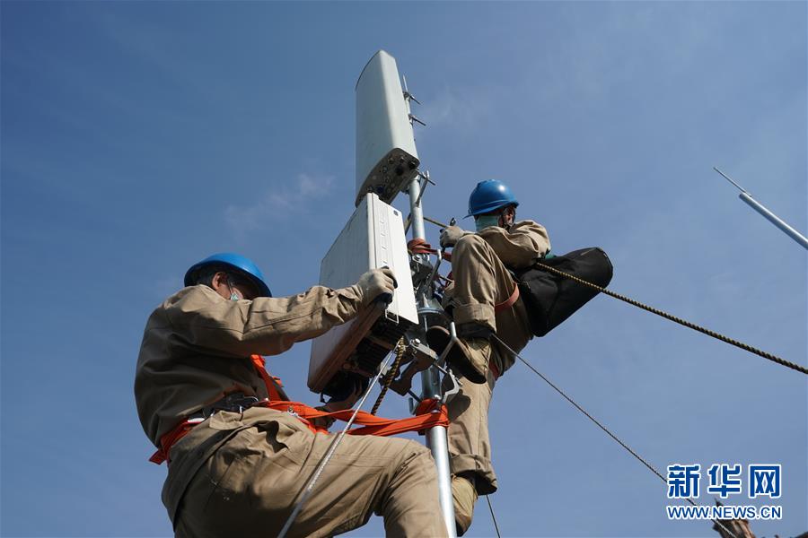 4月25日,在南京220千伏城南河變電站屋頂,工人在架設(shè)5G設(shè)備。當日,三大通信運營商的2座5G、3座4G基站建設(shè)工作在南京220千伏城南河變電站屋頂有序展開。在變電站內(nèi)建設(shè)基站可有效利用電網(wǎng)資源,縮短建設(shè)周期,節(jié)約建設(shè)成本。新華社記者季春鵬攝