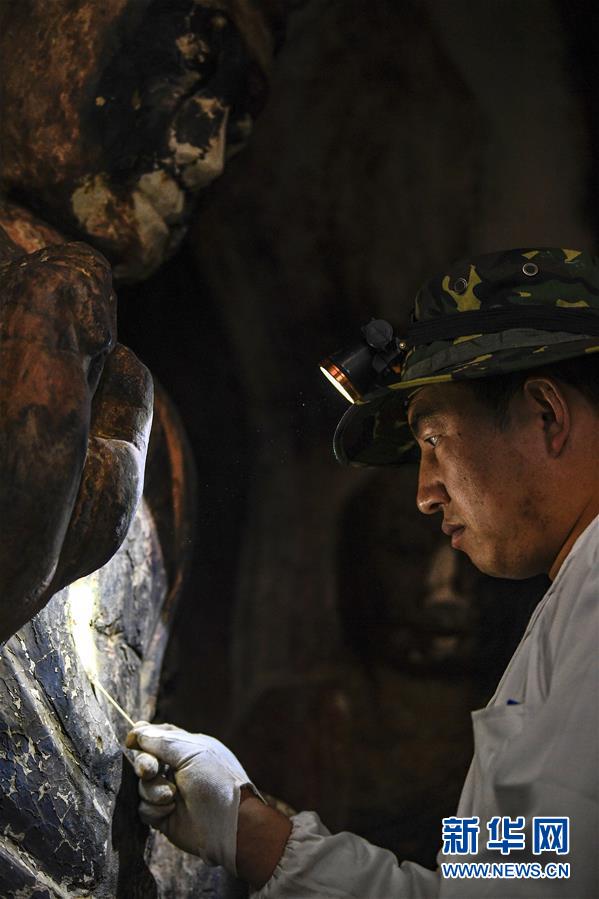 4月27日,文物修復(fù)專家在寧夏須彌山石窟圓光寺48號(hào)窟內(nèi)開展修復(fù)工作。新華社記者馮開華攝
