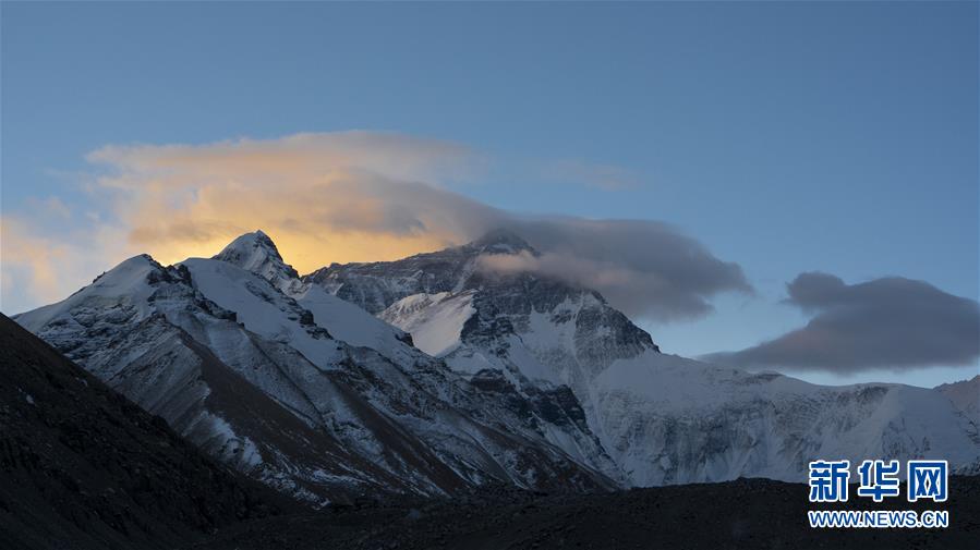 日出時分拍攝的珠峰(4月21日攝)。新華社記者旦增尼瑪曲珠攝