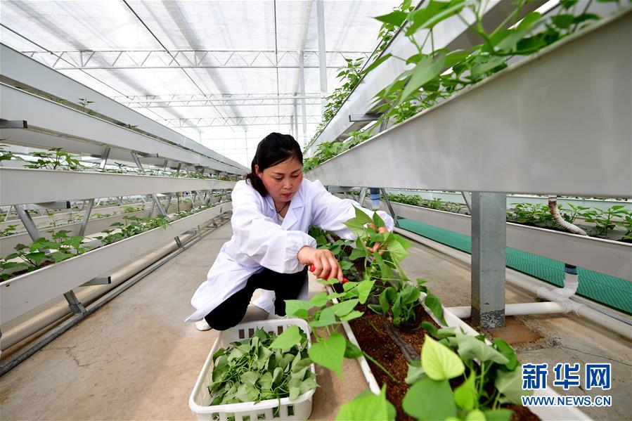 5月1日,村民在河南省鶴壁市淇濱區(qū)鉅橋鎮(zhèn)崗坡村飲馬泉甘薯脫毒快繁中心里剪苗。 新華社記者馮大鵬攝