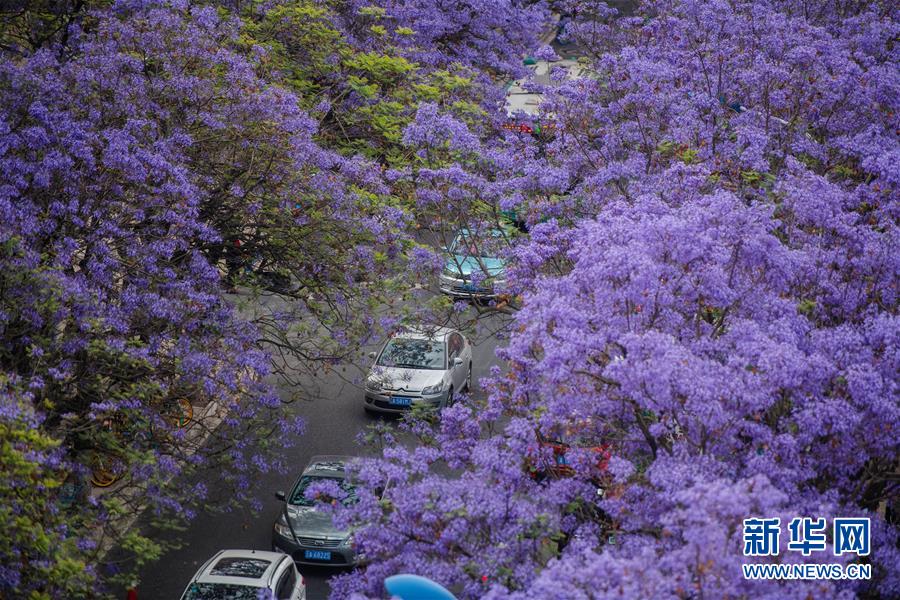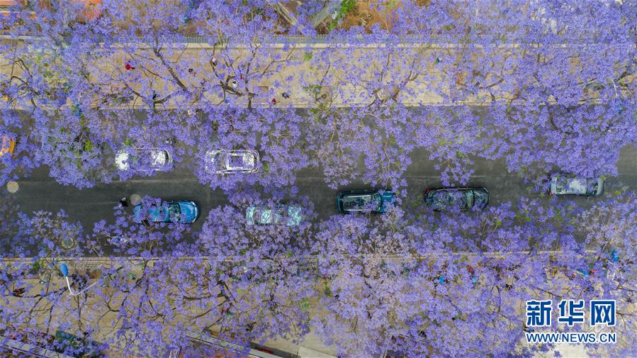 這是5月2日在昆明市桃源街拍攝的藍(lán)花楹。近日,云南省昆明市部分街區(qū)的藍(lán)花楹競(jìng)相開放,為春城增添靚麗風(fēng)景。新華社記者藺以光攝