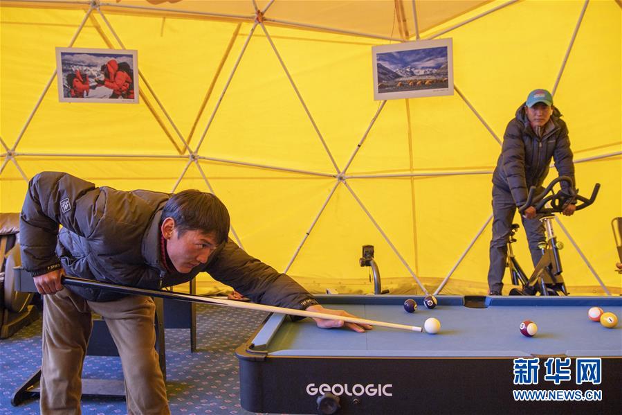 登山隊員在珠峰大本營內(nèi)打臺球(5月1日攝)。新華社記者孫非攝