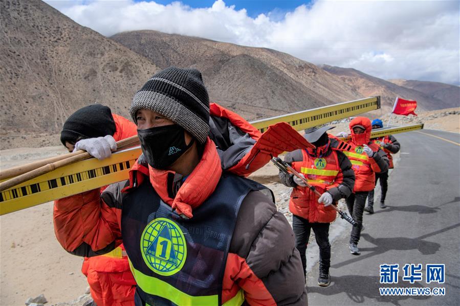 在西藏定日縣曲當(dāng)鄉(xiāng)境內(nèi),國(guó)測(cè)一大隊(duì)隊(duì)員前往水準(zhǔn)測(cè)量點(diǎn)(4月18日攝)。水準(zhǔn)測(cè)量是一種利用提供水平視線的儀器(如水準(zhǔn)儀、水準(zhǔn)標(biāo)尺),測(cè)定地面不同點(diǎn)之間的高差,并以此推算高度的一種方法,是經(jīng)典大地測(cè)量的重要技術(shù)之一。在目前正在進(jìn)行的2020珠峰高程測(cè)量中,部分國(guó)測(cè)一大隊(duì)隊(duì)員承擔(dān)了水準(zhǔn)測(cè)量的任務(wù)。新華社記者孫非攝