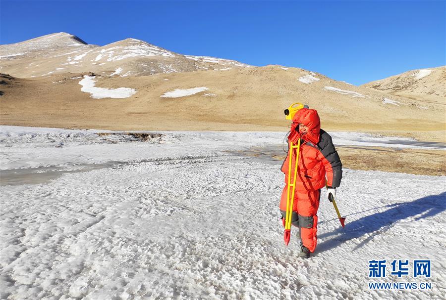 國(guó)測(cè)一大隊(duì)隊(duì)員霍申申在西藏定日縣扎西宗鄉(xiāng)境內(nèi)進(jìn)行水準(zhǔn)測(cè)量(4月4日攝)。水準(zhǔn)測(cè)量是一種利用提供水平視線的儀器(如水準(zhǔn)儀、水準(zhǔn)標(biāo)尺),測(cè)定地面不同點(diǎn)之間的高差,并以此推算高度的一種方法,是經(jīng)典大地測(cè)量的重要技術(shù)之一。在目前正在進(jìn)行的2020珠峰高程測(cè)量中,部分國(guó)測(cè)一大隊(duì)隊(duì)員承擔(dān)了水準(zhǔn)測(cè)量的任務(wù)。新華社發(fā)(楊明攝)
