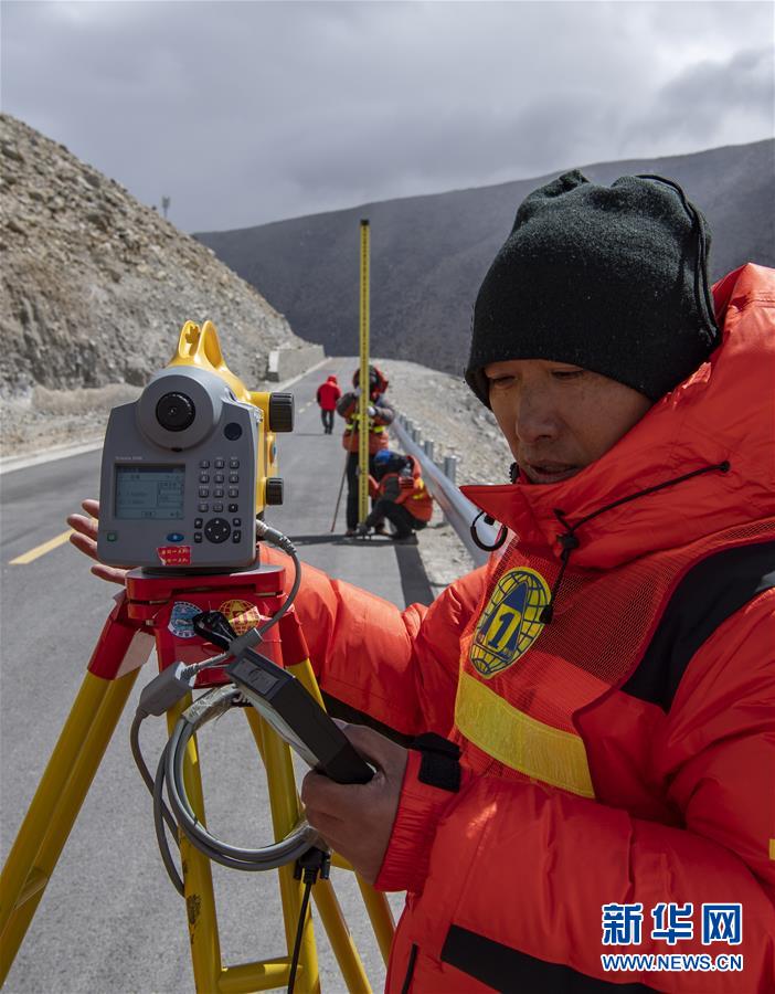 國(guó)測(cè)一大隊(duì)隊(duì)員楊明在西藏定日縣曲當(dāng)鄉(xiāng)境內(nèi)進(jìn)行水準(zhǔn)測(cè)量(5月4日攝)。水準(zhǔn)測(cè)量是一種利用提供水平視線的儀器(如水準(zhǔn)儀、水準(zhǔn)標(biāo)尺),測(cè)定地面不同點(diǎn)之間的高差,并以此推算高度的一種方法,是經(jīng)典大地測(cè)量的重要技術(shù)之一。在目前正在進(jìn)行的2020珠峰高程測(cè)量中,部分國(guó)測(cè)一大隊(duì)隊(duì)員承擔(dān)了水準(zhǔn)測(cè)量的任務(wù)。新華社記者普布扎西攝