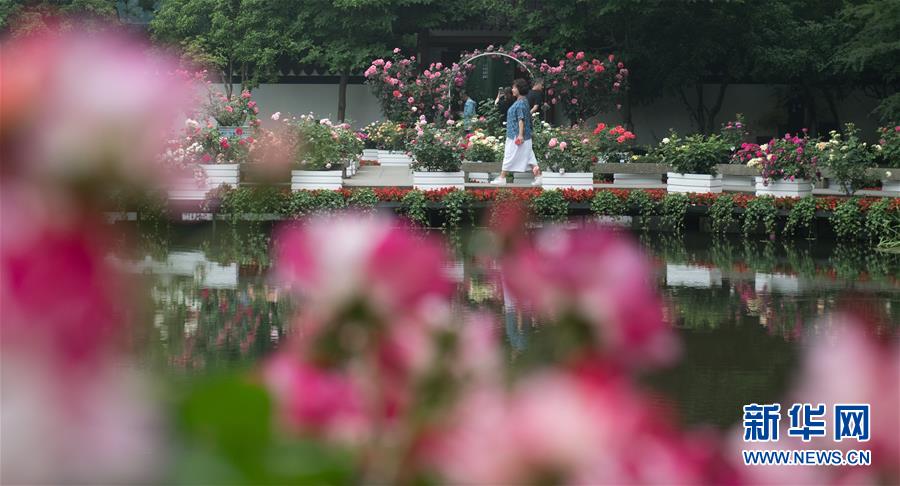 5月5日,游客在西湖畔的郭莊觀看月季花展?!拔逡弧逼陂g,第八屆杭州西湖月季花精品展在杭州西子湖畔舉行,展出國內(nèi)外700余個月季品種。新華社記者翁忻旸攝