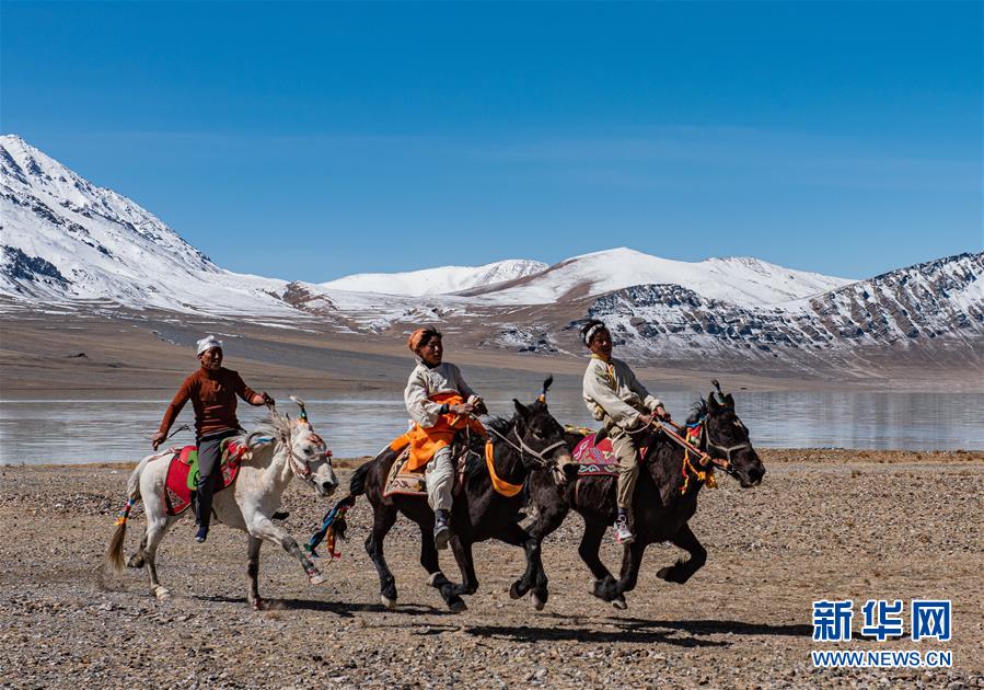 西藏那曲市尼瑪縣文部鄉(xiāng)北村的村民們騎馬在當(dāng)穹錯旁角逐(4月30日攝)。新華社記者侯捷攝