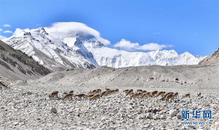 一群巖羊在珠峰大本營附近覓食(5月8日攝)。當(dāng)日,一群巖羊在珠峰大本營周圍覓食,黃嘴山鴉飛到巖羊身上停留,構(gòu)成一幅幅生動(dòng)有趣的雪域圖畫。新華社記者晉美多吉攝