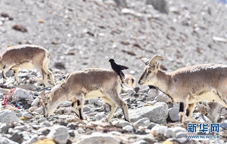 一只黃嘴山鴉停留在巖羊身上(5月8日攝)。當(dāng)日,一群巖羊在珠峰大本營周圍覓食,黃嘴山鴉飛到巖羊身上停留,構(gòu)成一幅幅生動(dòng)有趣的雪域圖畫。新華社記者晉美多吉攝