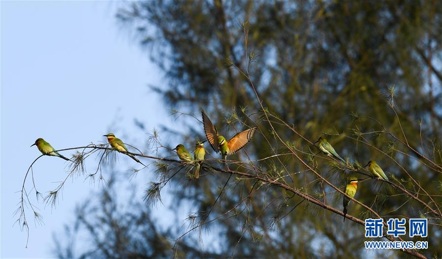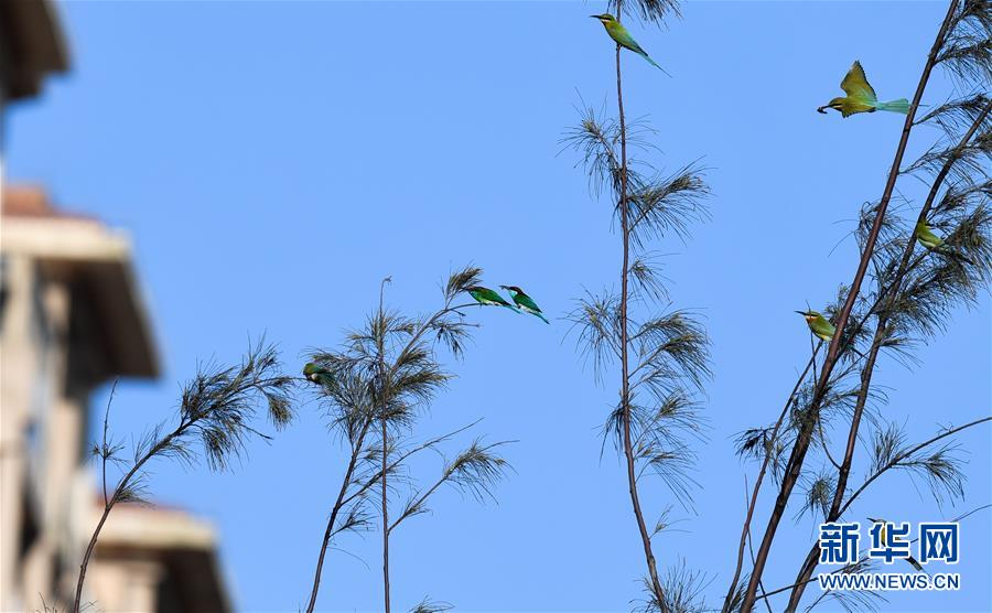 5月8日,在??谖逶春酉掠畏浠⒈Wo(hù)小區(qū),栗喉蜂虎和藍(lán)喉蜂虎在樹枝上休息。新華社記者楊冠宇攝