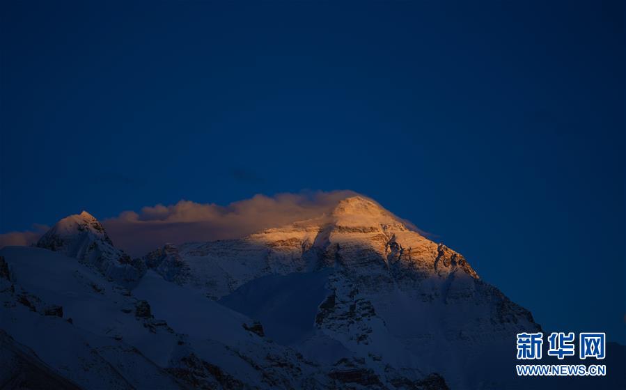 這是5月3日拍攝的夕陽下的珠峰。世界第一高峰珠穆朗瑪峰終年積雪,頂峰云霧繚繞,美不勝收。新華社記者多吉占堆攝