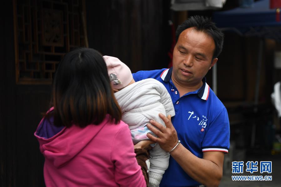 施六金(右)從妻子手中接過(guò)兒子施澤恩(4月25日攝)。1973年出生于十八洞村的施六金,由于父親患病很早就放棄學(xué)業(yè)和母親扛起了家庭的重?fù)?dān)。為了生活,他還曾遠(yuǎn)去東南亞打工。2015年,看到家鄉(xiāng)的變化,施六金回到村里開(kāi)起了農(nóng)家樂(lè),年度家庭人均純收入也從2014年的1715元增長(zhǎng)到了2019年的35696元。2018年,施六金與心愛(ài)的人組建了家庭。今年初,施六金與愛(ài)人迎來(lái)了一個(gè)大胖小子?!白鋈俗鍪乱没貓?bào)和感恩?!笔┝鸾o剛出生的兒子取名施澤恩。新華社記者薛宇舸攝