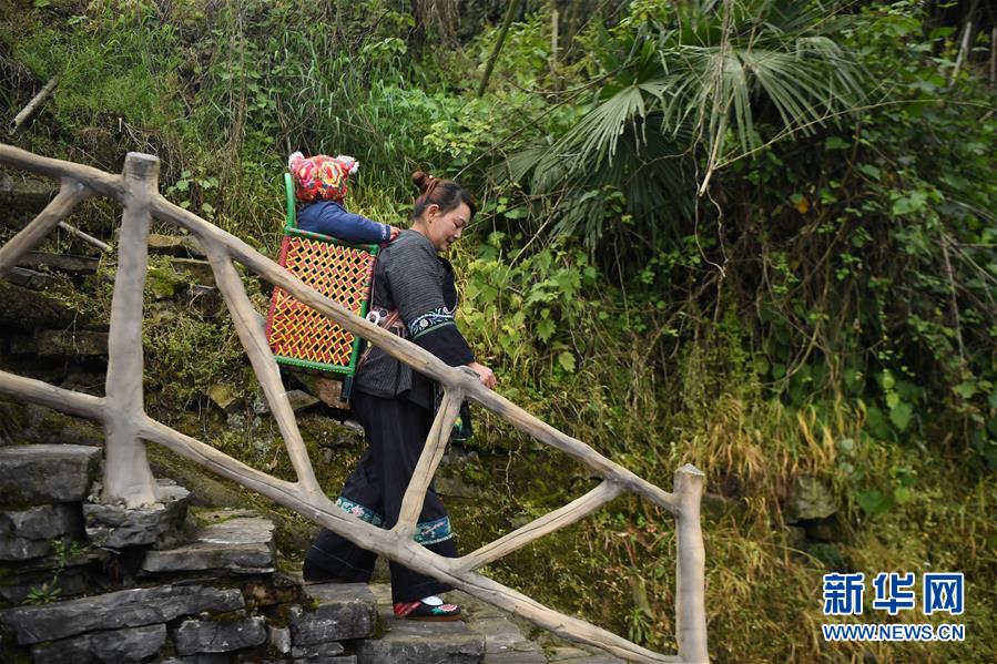 吳美金背著孫子走在十八洞村中,準(zhǔn)備前往村里的苗繡合作社(4月24日攝)。1967年出生的吳美金,1992年嫁入飛蟲(chóng)村(現(xiàn)十八洞村飛蟲(chóng)寨)時(shí),只有爛泥路的飛蟲(chóng)村不僅田土少,掙錢(qián)活路也少,生活十分困難。2014年,吳美金加入了十八洞村苗繡特產(chǎn)農(nóng)民專(zhuān)業(yè)合作社,從小就會(huì)的苗繡傳統(tǒng)手藝如今成了家庭增收的法寶,不僅在家門(mén)口就把錢(qián)掙了,同時(shí)還能照顧年幼的孫子孫女?!艾F(xiàn)在的日子,比年輕的時(shí)候好多了?!眳敲澜鹫f(shuō)。新華社記者薛宇舸攝