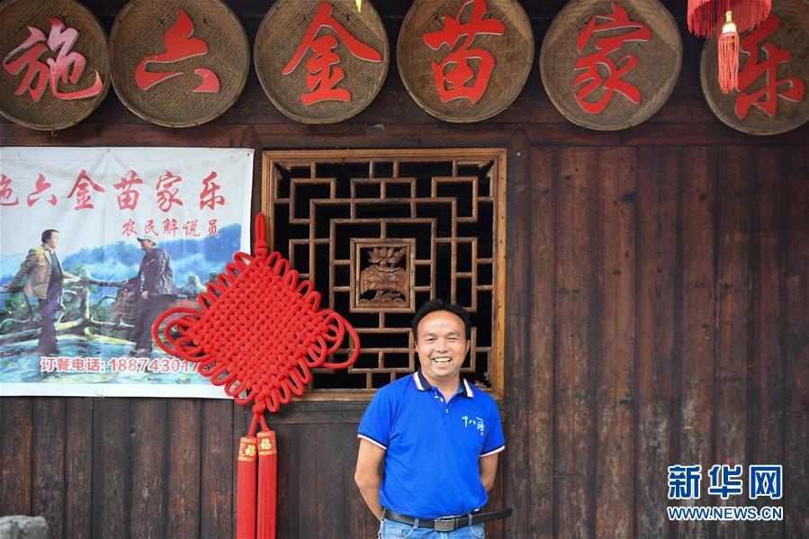 這是施六金在他的農(nóng)家樂(lè)前留影(4月25日攝)。1973年出生于十八洞村的施六金,由于父親患病很早就放棄學(xué)業(yè)和母親扛起了家庭的重?fù)?dān)。為了生活,他還曾遠(yuǎn)去東南亞打工。2015年,看到家鄉(xiāng)的變化,施六金回到村里開(kāi)起了農(nóng)家樂(lè),年度家庭人均純收入也從2014年的1715元增長(zhǎng)到了2019年的35696元。2018年,施六金與心愛(ài)的人組建了家庭。今年初,施六金與愛(ài)人迎來(lái)了一個(gè)大胖小子?!白鋈俗鍪乱没貓?bào)和感恩?!笔┝鸾o剛出生的兒子取名施澤恩。新華社記者薛宇舸攝