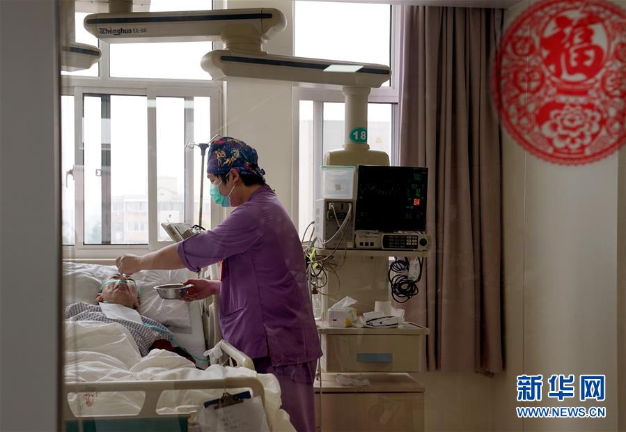 5月10日,在上海市普陀區(qū)中心醫(yī)院內(nèi)科重癥監(jiān)護(hù)室,護(hù)士金鑫給患者喂飯。新華社記者劉穎攝