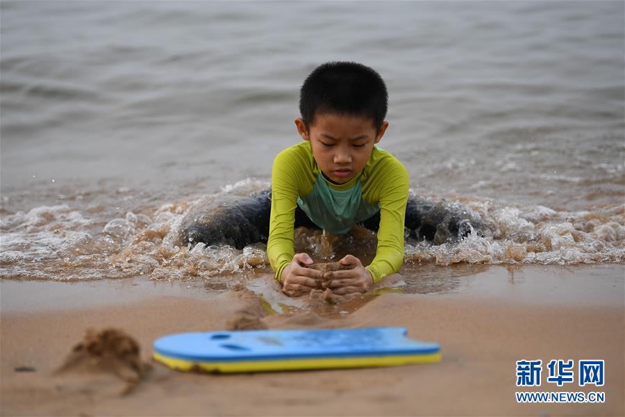 5月10日,市民在??谖餍愫┖S驊蛩=?,??诔掷m(xù)高溫,不少市民前往海灘戲水消暑。新華社記者蒲曉旭攝