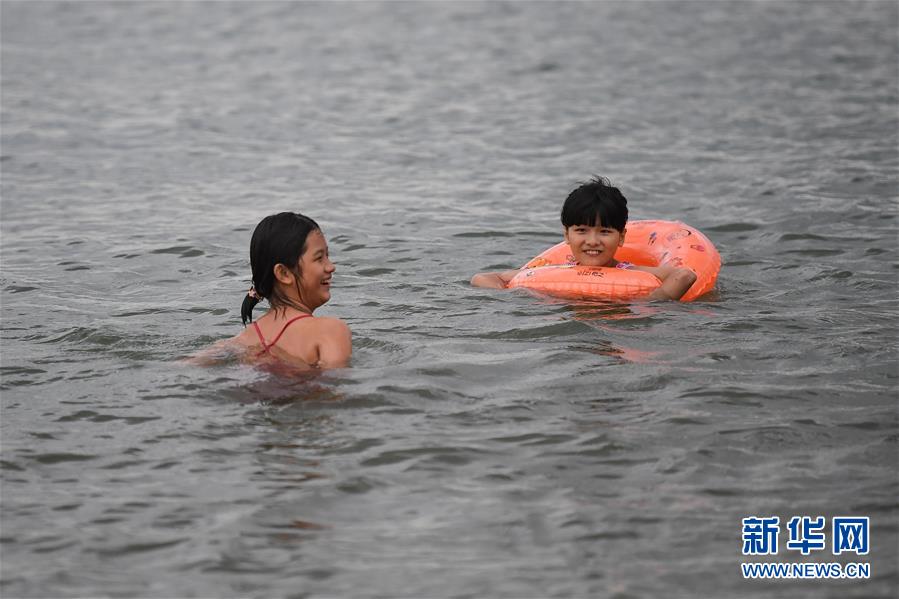 5月10日,市民在??谖餍愫┖S驊蛩?。近日,海口持續(xù)高溫,不少市民前往海灘戲水消暑。新華社記者蒲曉旭攝
