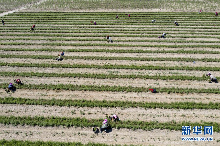 5月11日,采茶工在寧夏百瑞源賀蘭山基地采摘枸杞芽茶(無人機照片)。當日,寧夏百瑞源賀蘭山基地枸杞芽茶全面進入采摘季。據(jù)了解,該基地茶園面積300余畝,助力附近200多名農(nóng)民就業(yè)增收。新華社記者楊植森攝