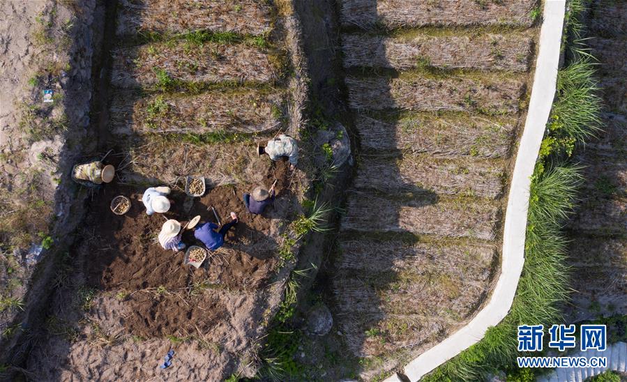 5月12日,青田縣巨浦鄉(xiāng)西坑村的村民在梯田收獲中藥貝母(無人機照片)。新華社記者徐昱攝