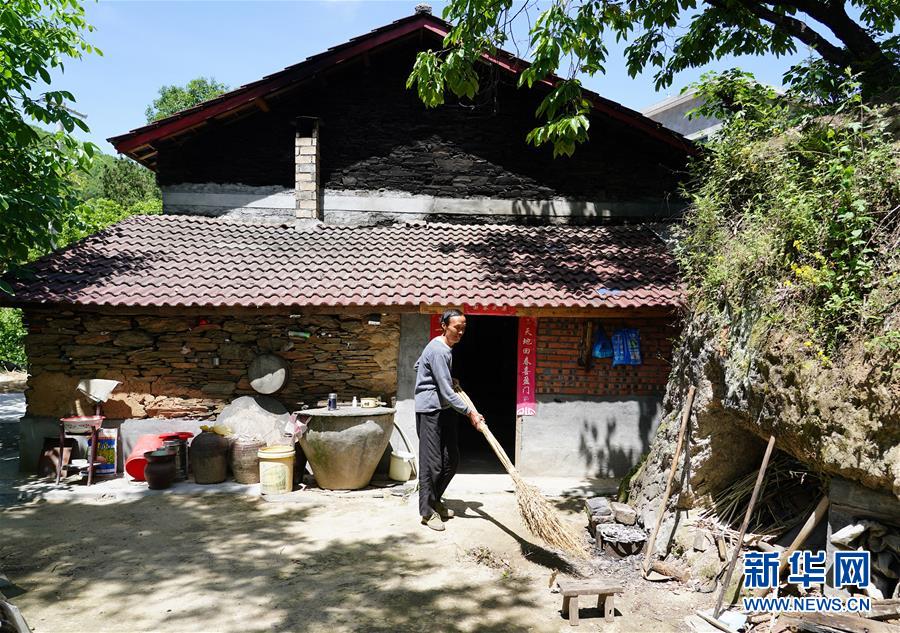 5月12日,在安康市漢濱區(qū)石梯鎮(zhèn)煙嶺村,村民李均田在自家改造后的房屋前掃地。新華社記者邵瑞攝