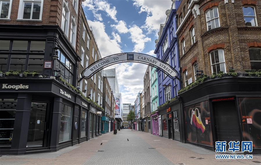 5月12日,英國(guó)倫敦主要商業(yè)街之一的卡納比街上的店鋪全部關(guān)閉。新華社記者韓巖攝