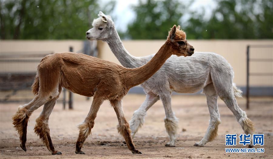 5月12日,兩只剪下絨毛的羊駝在養(yǎng)殖基地的飼養(yǎng)舍里。新華社記者姚劍鋒攝