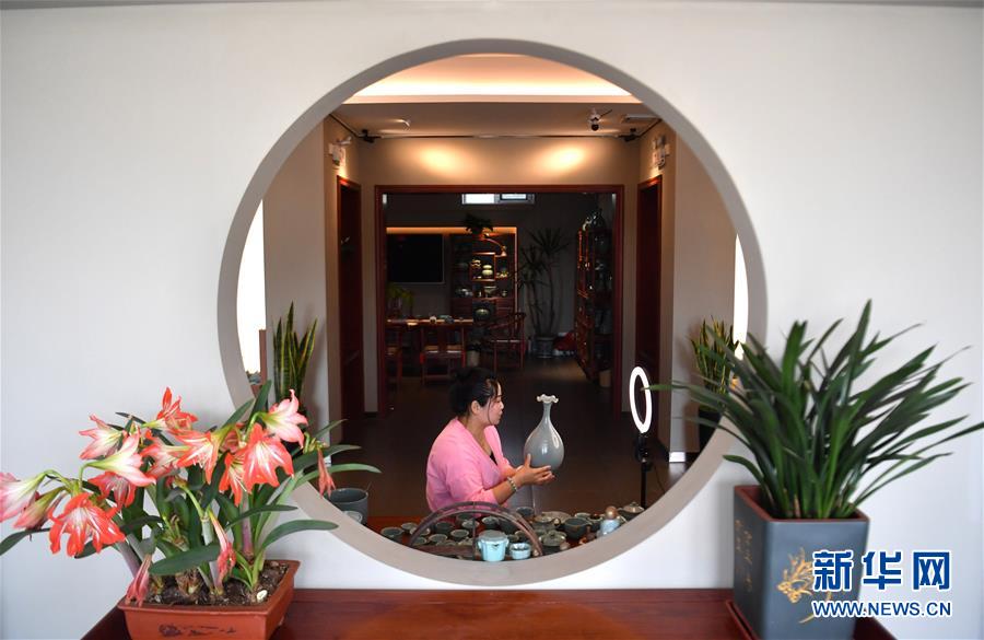 5月13日,寶豐縣大營鎮(zhèn)的汝瓷藝人李瑩娟在宣和汝瓷展廳直播介紹汝瓷產(chǎn)品。新華社記者李嘉南攝