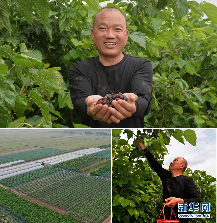 這是一張拼版照片(圖片均為5月16日攝)。上圖:在河南省開封市尉氏縣大橋鄉(xiāng)馮村,50歲的文海軍在他的黃瓜種植大棚內(nèi)采摘黃瓜;下左圖:在扶貧政策扶持下,文海軍蓋了占地6畝的蔬菜溫室大棚(無人機照片);下右圖:文海軍駕駛?cè)嗆囘\輸采摘的黃瓜。新華社記者孫清清攝