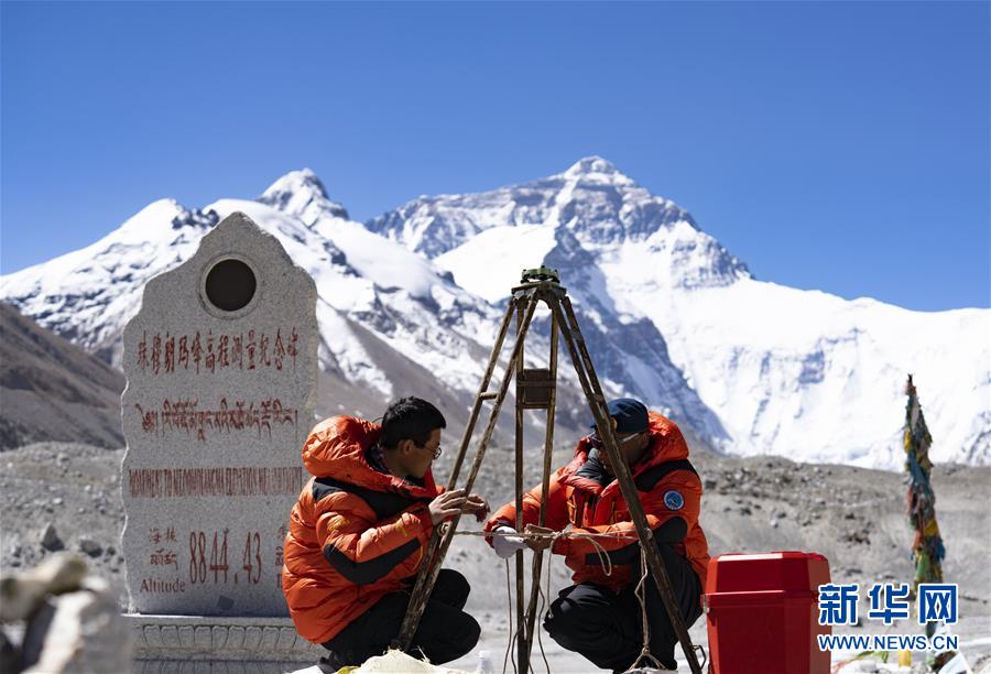 國測一大隊隊員在珠峰大本營附近測試設(shè)備(5月17日攝)。新華社記者普布扎西攝
