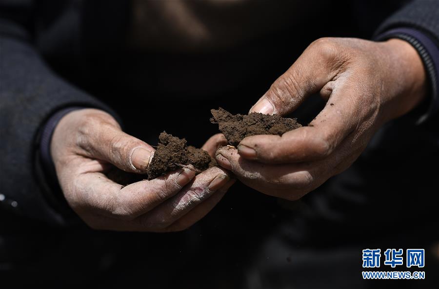 在青海省海北藏族自治州海晏縣青海湖鄉(xiāng)同寶村,者成倉(cāng)在地里查看土壤狀況(5月13日攝)。新華社記者張宏祥攝